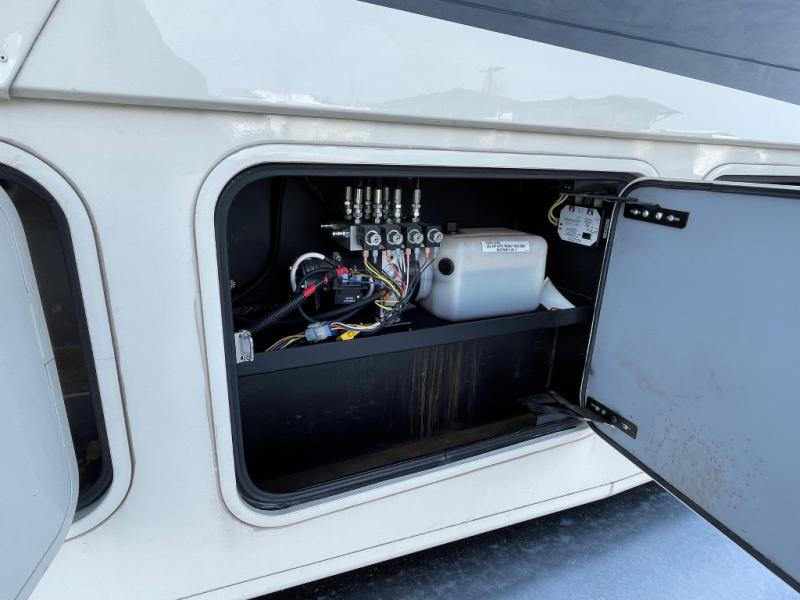 The living area and kitchen are located in the front of the motor home. There is a refrigerator, and sofa on one side of the motor home. The other side offers a slide with a booth dinette and 32" LED TV above the dinette, large sink, three burner range, microwave, pantry with adjustable shelves, washer and dryer prep, and two closets.