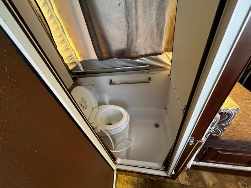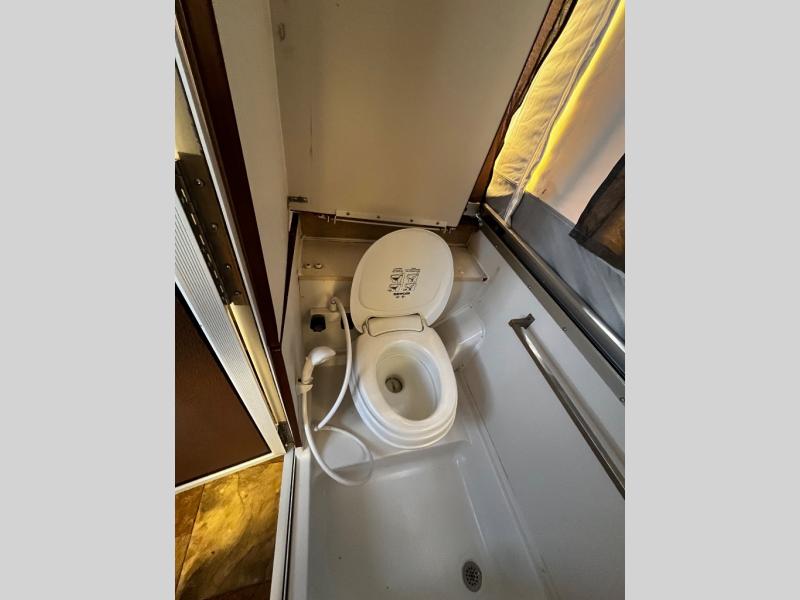 A hard wall shower area also provides a toilet and cabinet. A single slide out holds a 72" x 50" dinette with the water heater under one booth seat.