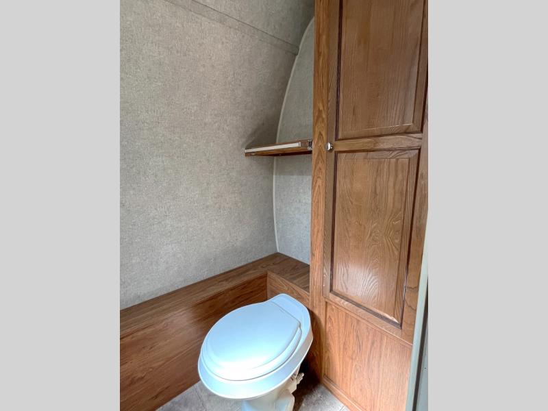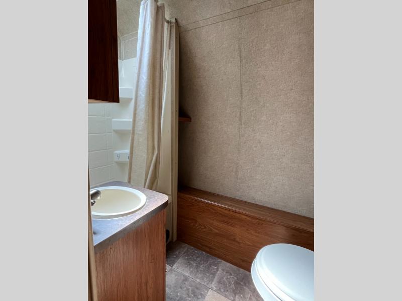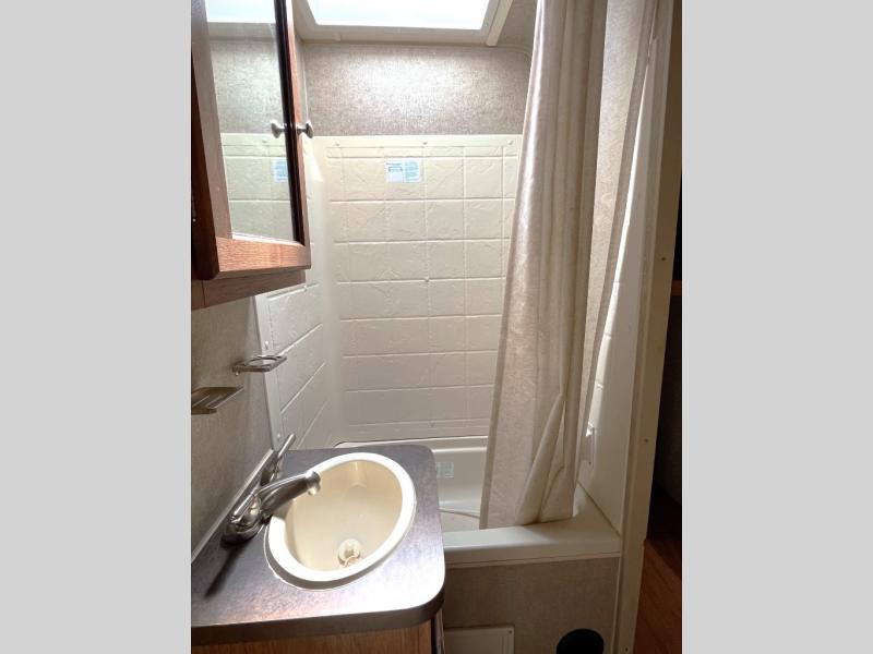 The Rockwood Mini Lite 1901 travel trailer by Forest River offers a rear bath with a toilet, linen cabinet, sink, medicine cabinet, and tub.