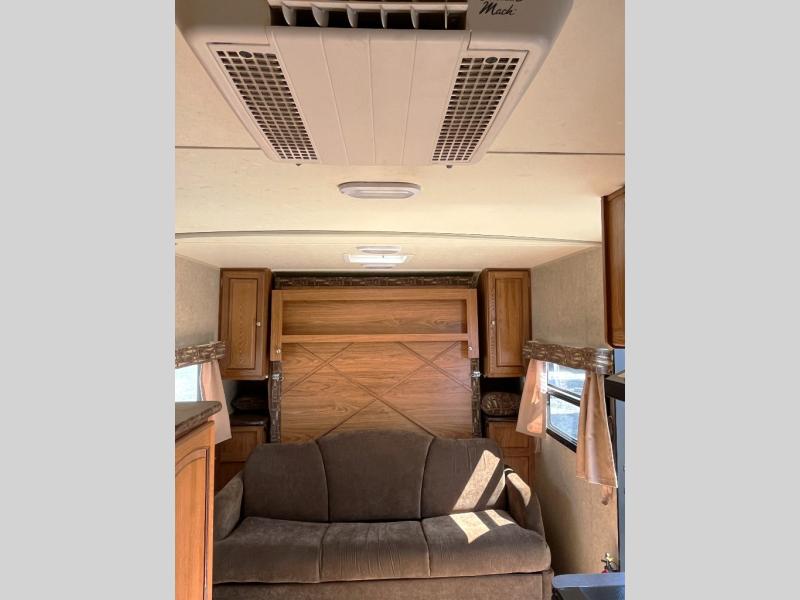 The front of the travel trailer offers a sofa and Murphy bed. There are wardrobes and nightstands on either side of the sofa.
