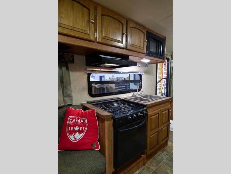 Upon entering the expandable, to the right there is a cabinet which is nice for quick storage. Along one side you will find a double kitchen sink, three burner range, microwave, and sofa. The opposite side of the expandable offers a dinette, swing arm TV, refrigerator, and wardrobe.