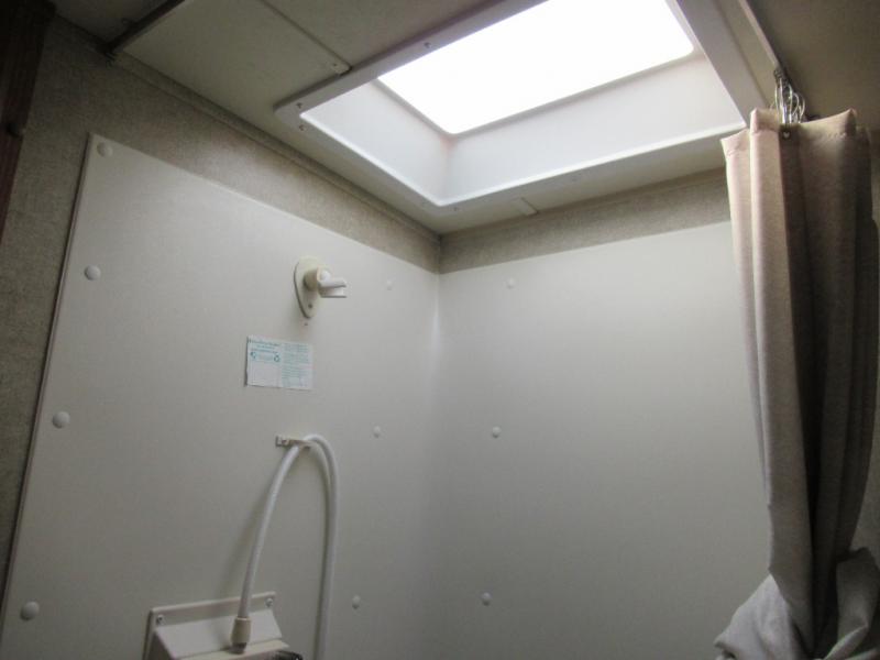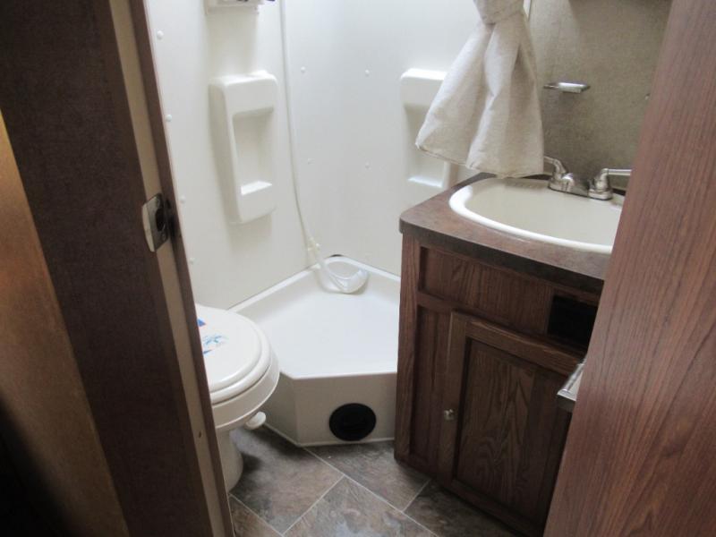 In the rear you will find a bathroom with a toilet, linen cabinet, shower, sink, and medicine cabinet.