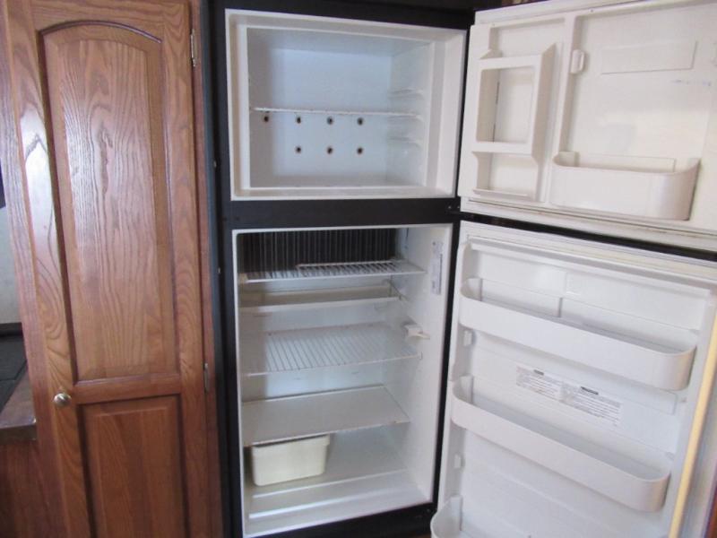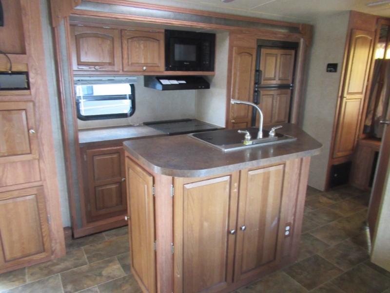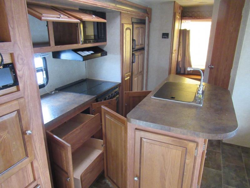There are front and rear queen tent beds on the expandable. To the left of the entrance you will find an entertainment center. The slide offers a three burner range, microwave, extra counter space, refrigerator, and a pantry. Next to the slide there is a wardrobe and a pantry. The opposite side offers a slide with a sofa and a dinette. This expandable is unique in the fact that there is a kitchen island. The kitchen island offers extra counter space and a double kitchen sink.