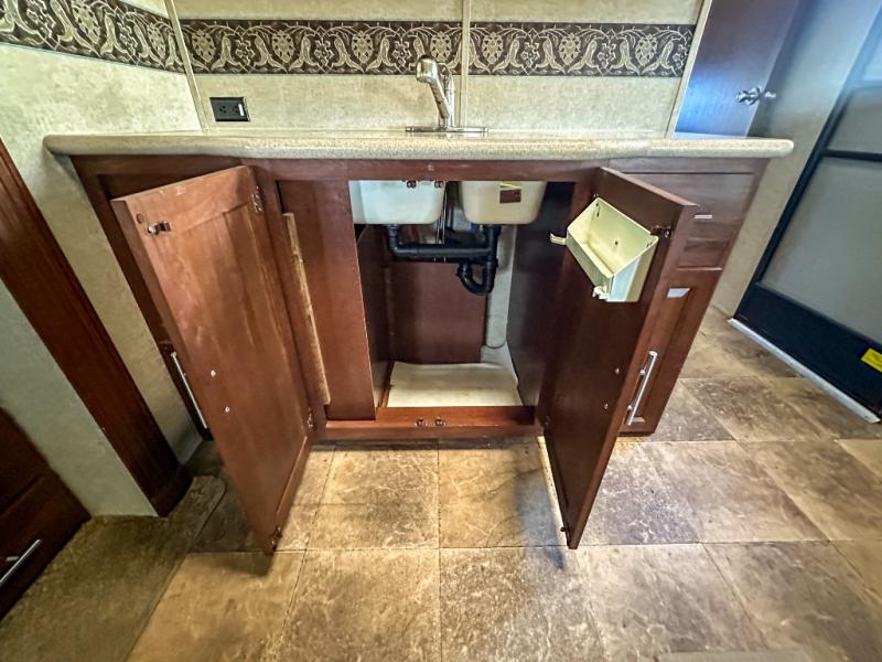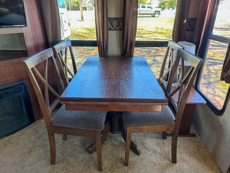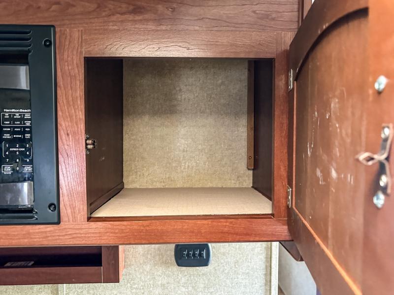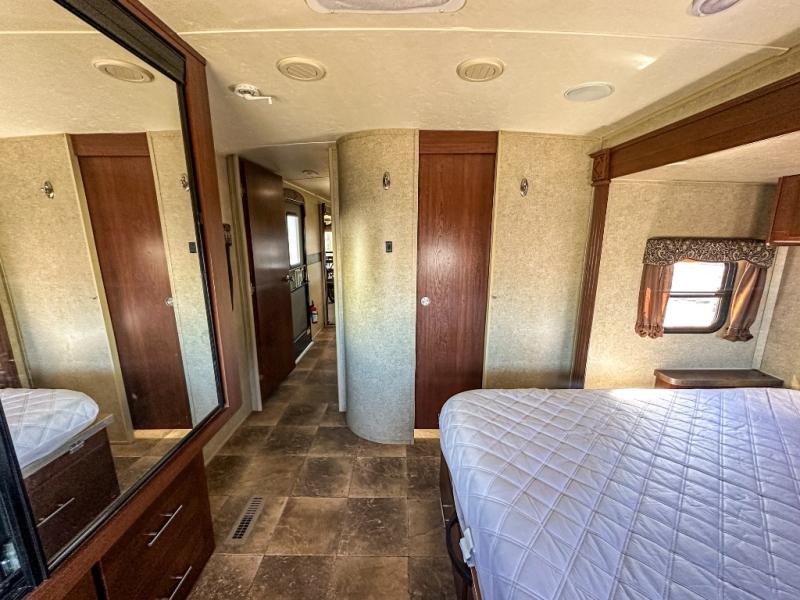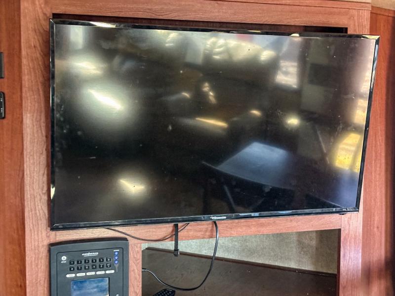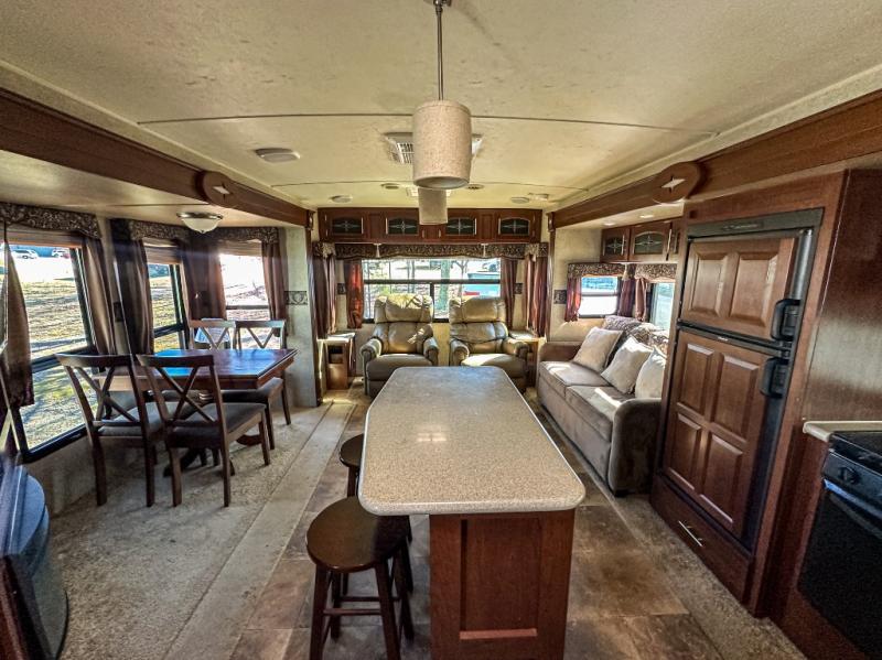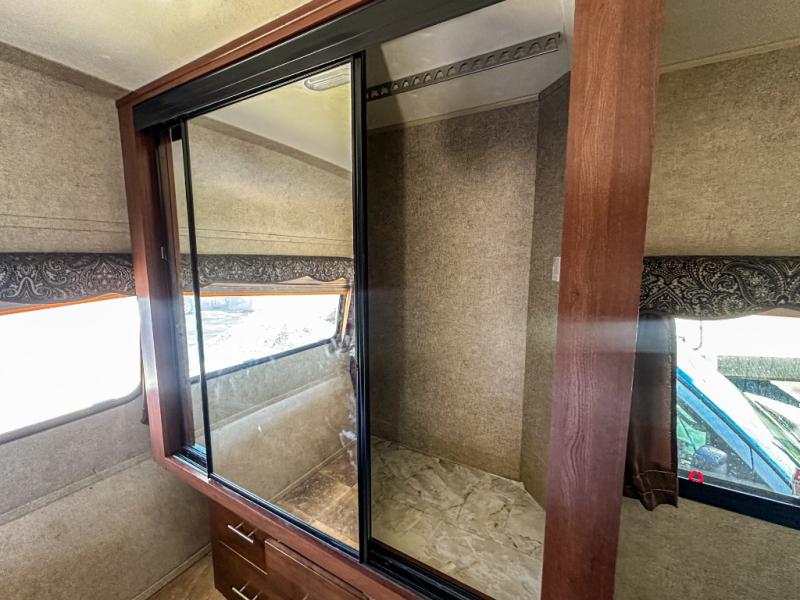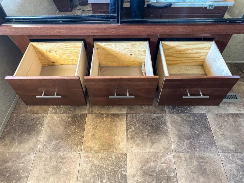 What I liked most: Exterior color and graphics are classy with window no trim look. Floor plan has open feel with plenty of seating for guests, including small bar counter on island kitchen. Very comfortable recliners and love-seat. Nice bedroom wardrobe with mirror and chest of drawers underneath. Room to move around in bedroom.
