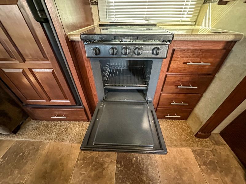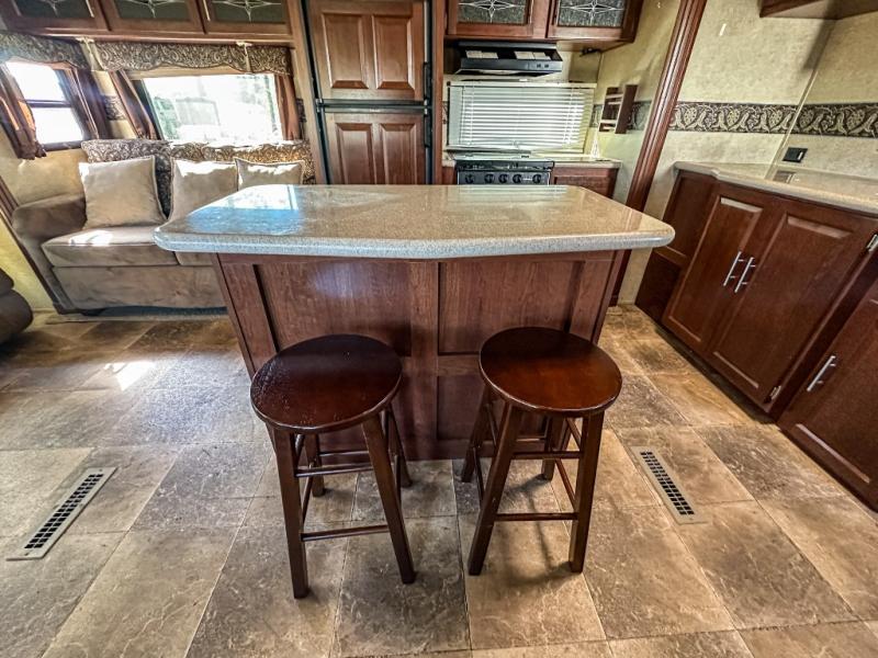 To the left of the entrance you will find a slide with a corner entertainment center and a free-standing table and chairs. Along the rear wall there are two chairs and three end tables, or you can choose optional recliners. The other slide has a hide-a-bed sofa, refrigerator, and three burner range. You will also find a large kitchen sink surrounded by extra counter space. The kitchen island is a great place to fix your meals. There are two bar stools that pull up to the island.