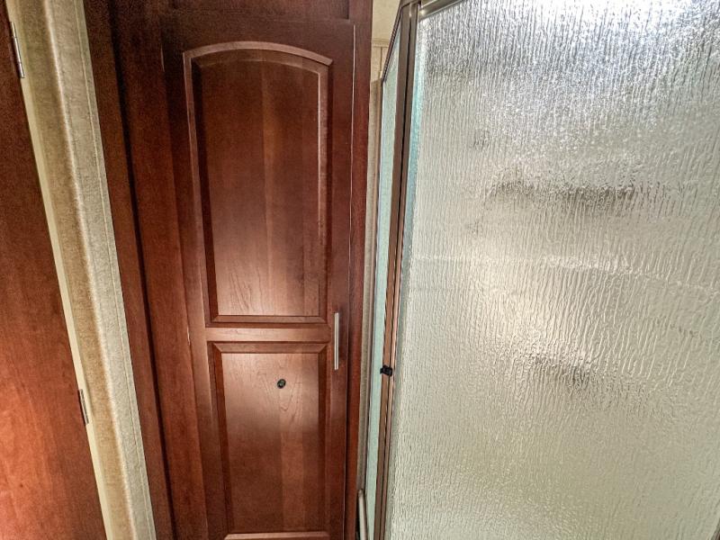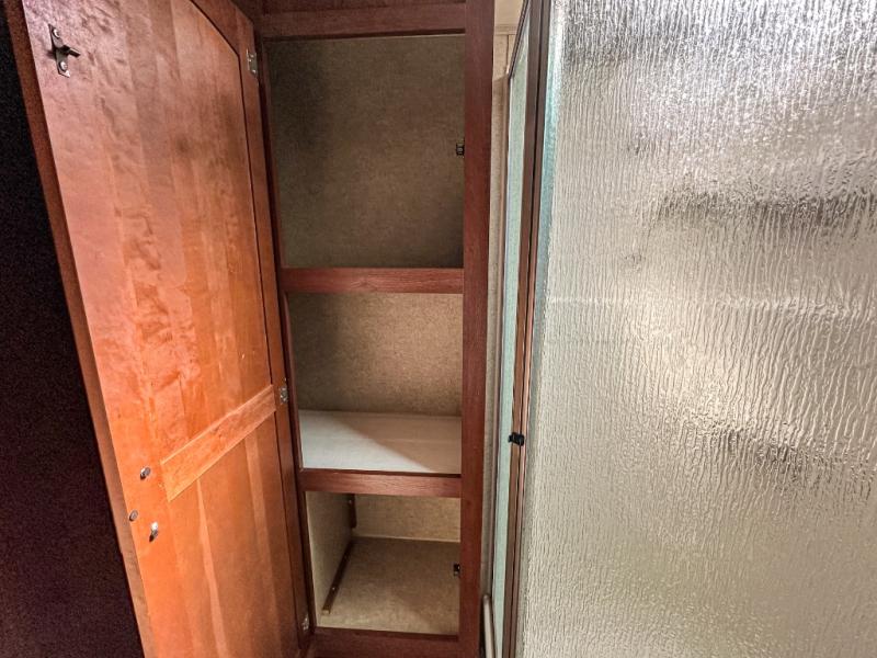 The front bedroom offers a queen bed slide with nightstands on either side of the bed. Across from the bed you will find a large wardrobe and an optional wall mount TV.