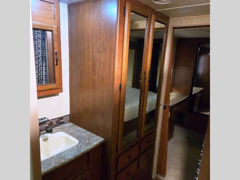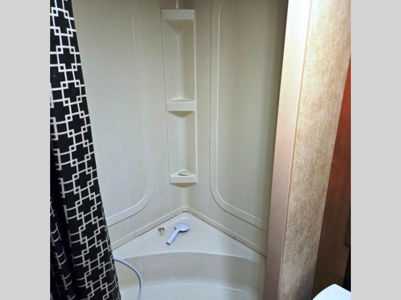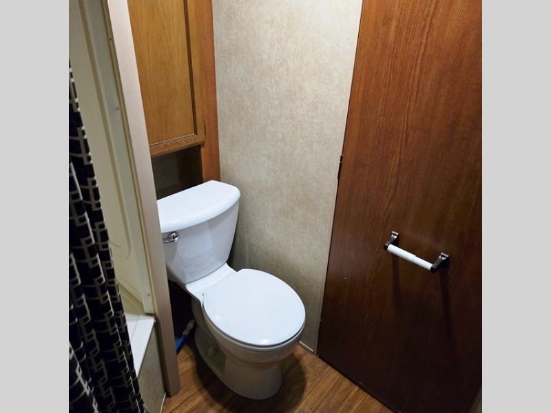 The bathroom is a walk-thru with a sink, medicine cabinet, and wardrobe with drawers on one side of the travel trailer and a toilet with a garden shower on the other side.