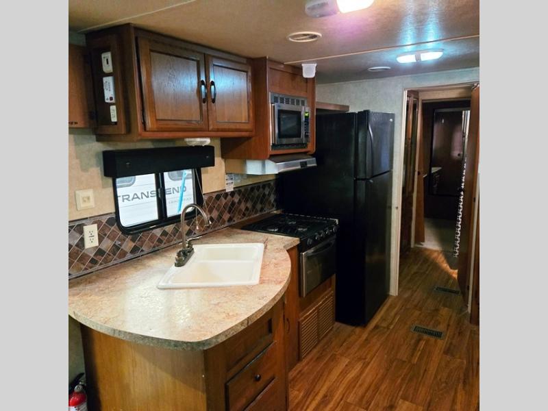 The kitchen and living area have a slide with a sofa and a dinette. Next to the dinette there is a nice size pantry. The opposite side of the trailer has a double kitchen sink, three burner range, microwave, and a large refrigerator.