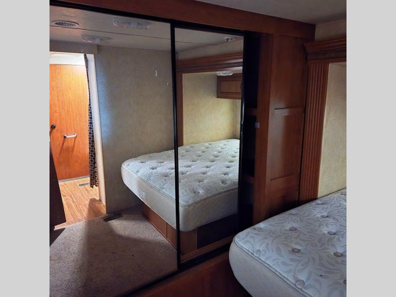 To the right of the entrance you will find an entertainment center. Just around the corner there is a front bunk house with a set of bunk beds on one side and a dinette and a hinged bunk above the dinette on the other side. Along the front of the room there is a wardrobe and entertainment center.