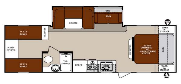 The rear bunk house offers two sets of bunks and a wardrobe/entertainment center.