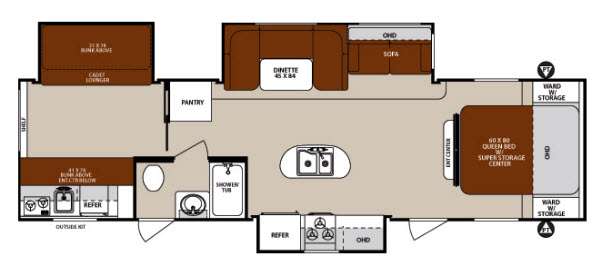 The rear bunk house offers three places to sleep with the cadet lounger slide with a bunk above and a bunk above the entertainment center. This is a room that your kids will truly enjoy.