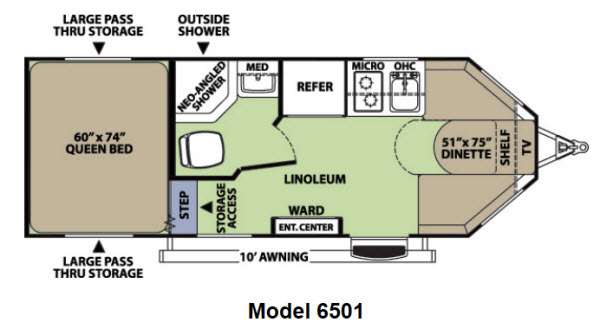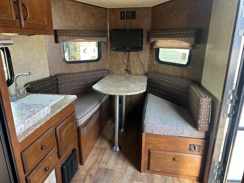 As you enter the travel trailer, along the front wall you will find a 51" x 75" dinette with a shelf and TV above the dinette.