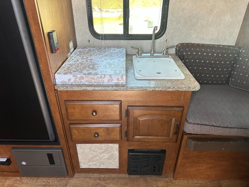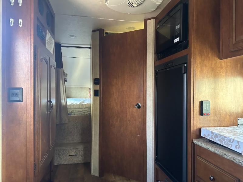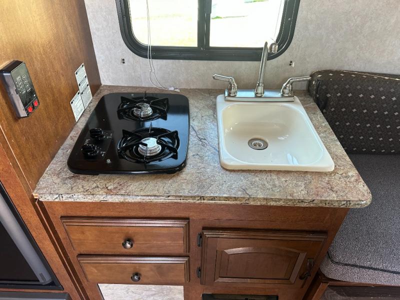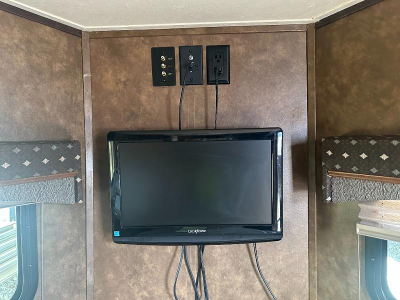 One side of the trailer has a sink, two burner range, microwave, and refrigerator. The opposite side offers an entertainment center.