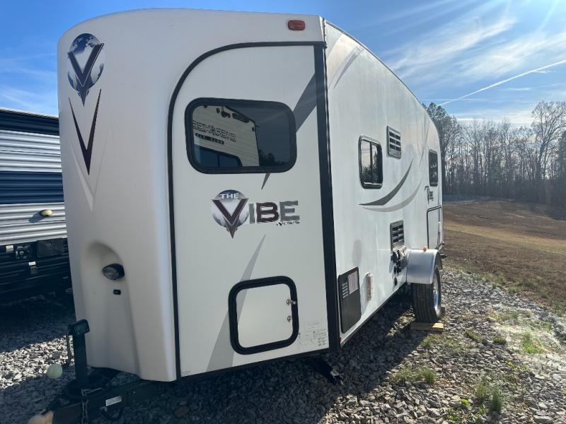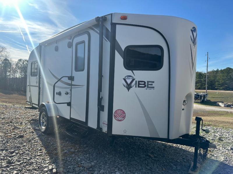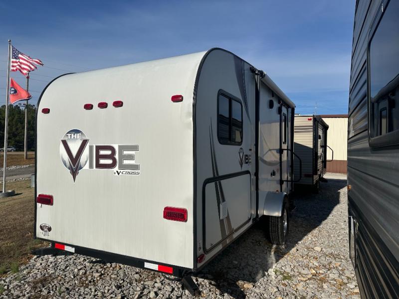 The V-Cross Vibe 6501 6500 Series travel trailer by Forest River offers a v-nose and a rear queen bed.