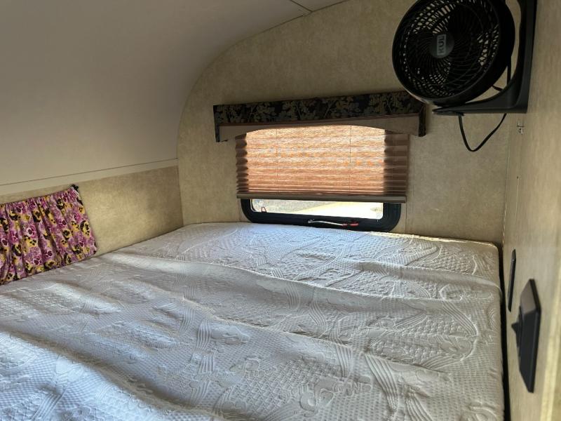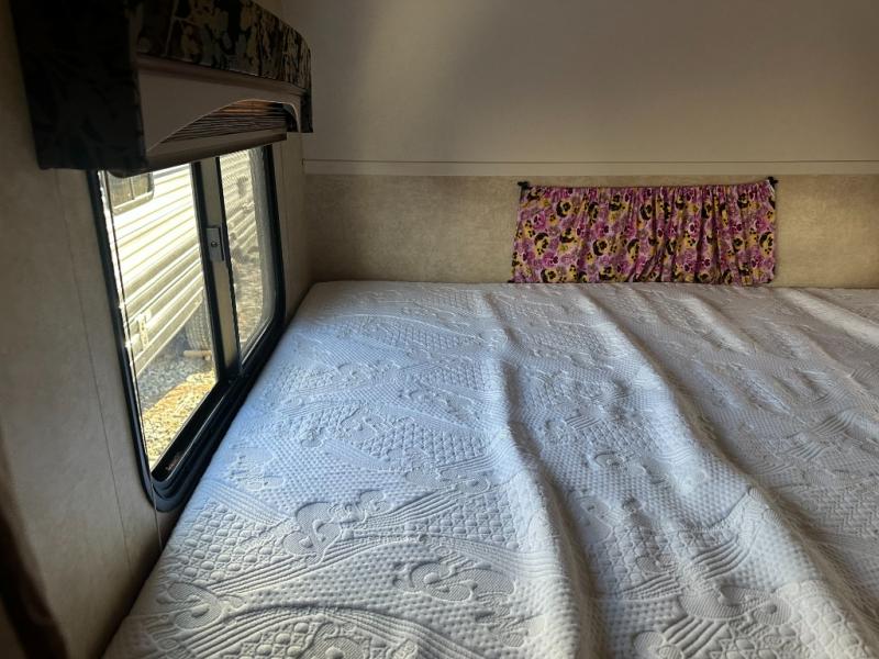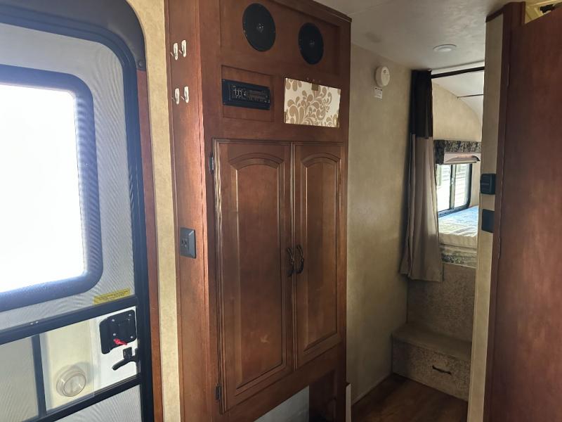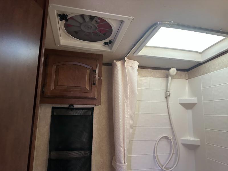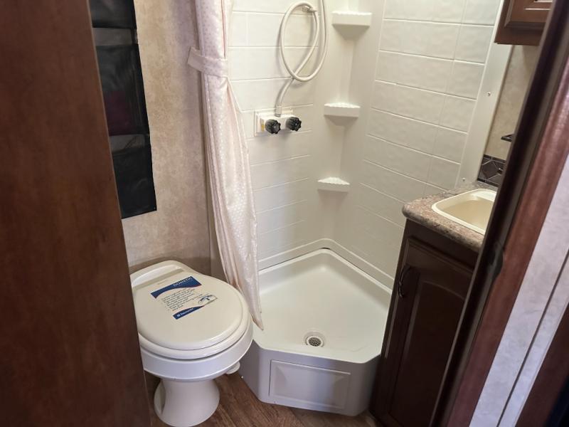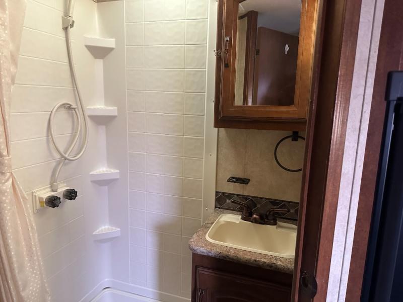 There are plenty of overhead cabinets throughout the travel trailer as well as a large exterior pass thru storage area. Outside you will even find an outside shower.