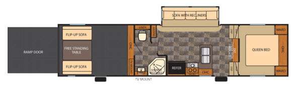 In the cargo you will find a flip-up sofa and free standing table. There is easy loading and unloading of your off-road toys with the large rear ramp door. In the corner you will find a tv mount.