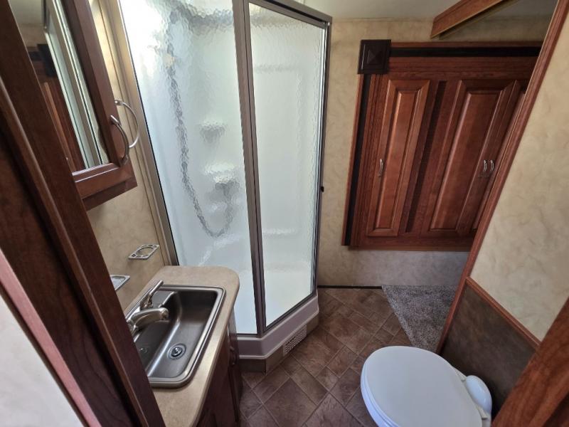 The side aisle bath has a sink, toilet, neo-angle shower.