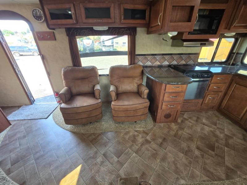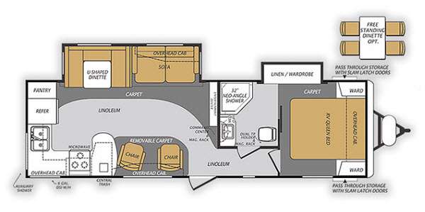 Stepping inside the travel trailer, to the left there are two lounge chairs. On the opposite side you will find a u-dinette or optional free-standing dinette, and a sofa slide. Next to the slide there is an entertainment center.