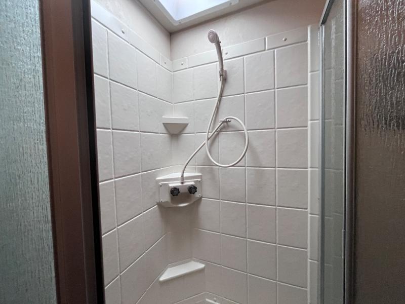 The side aisle bath has a sink, medicine cabinet, neo-angle shower, toilet, and linen cabinet.