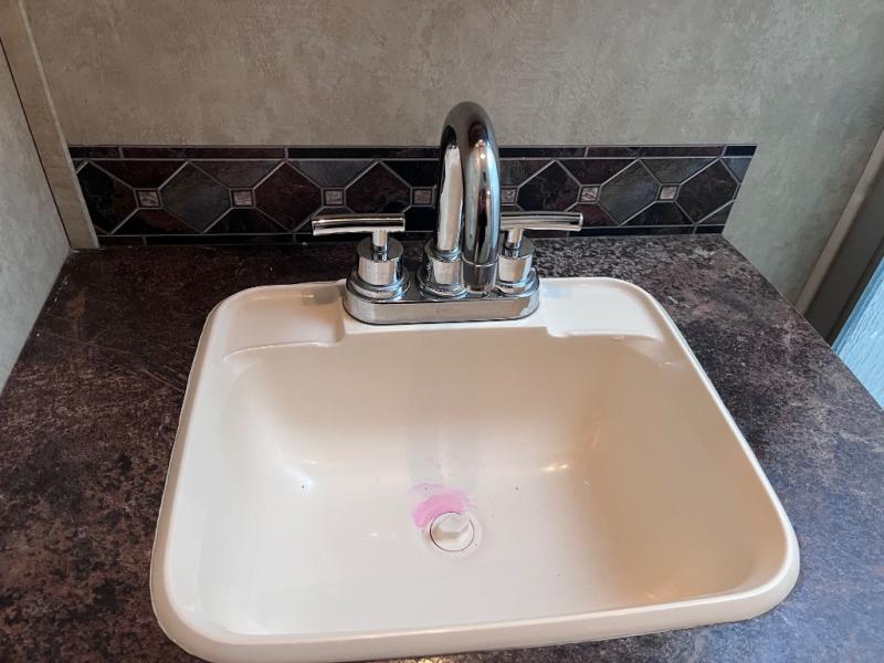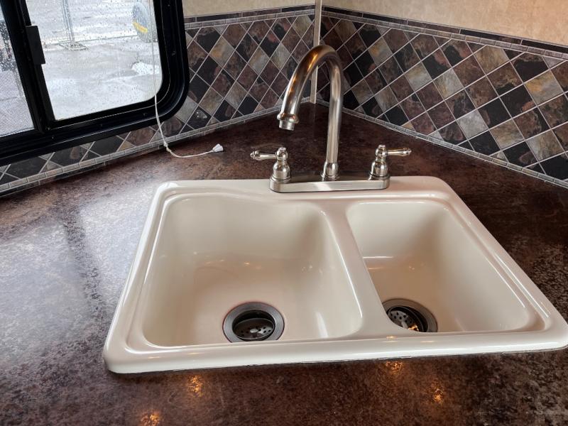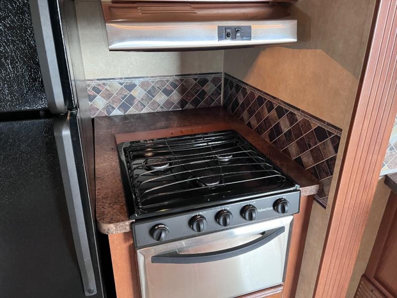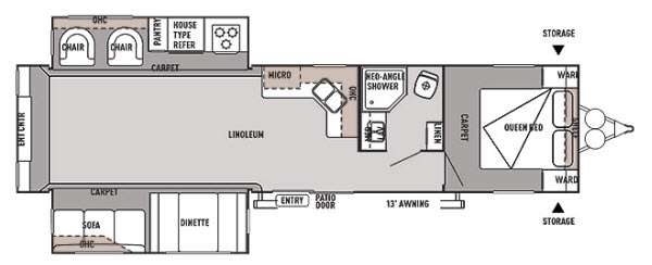 As you enter the travel trailer there are two slides in the main living area. To the left, is a slide with a dinette and sofa. Along the rear wall you will find an entertainment center. The other slide has two lounge chairs, pantry, refrigerator, and three burner range. You will also find a microwave, and double kitchen sink in the kitchen area.