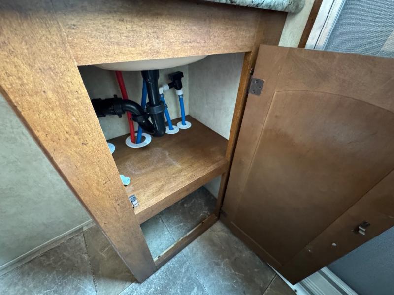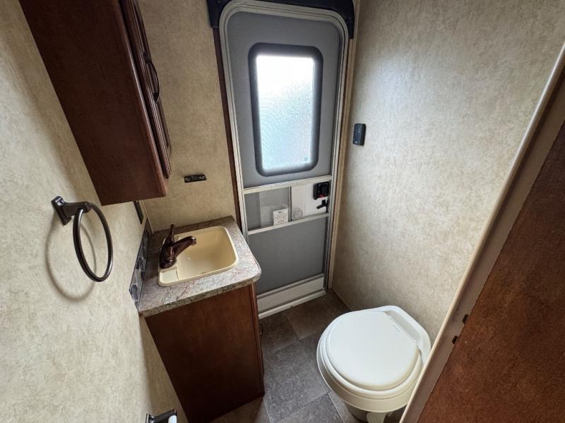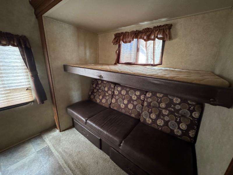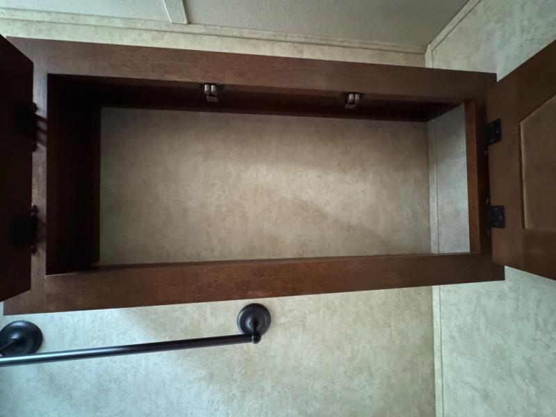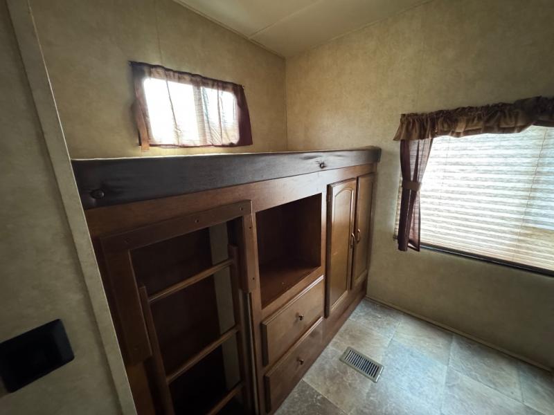 The rear bunk house has a set of bunk beds slide. There is also a wardrobe with a bunk above the wardrobe. Off of the bunk house you will find a half bath.