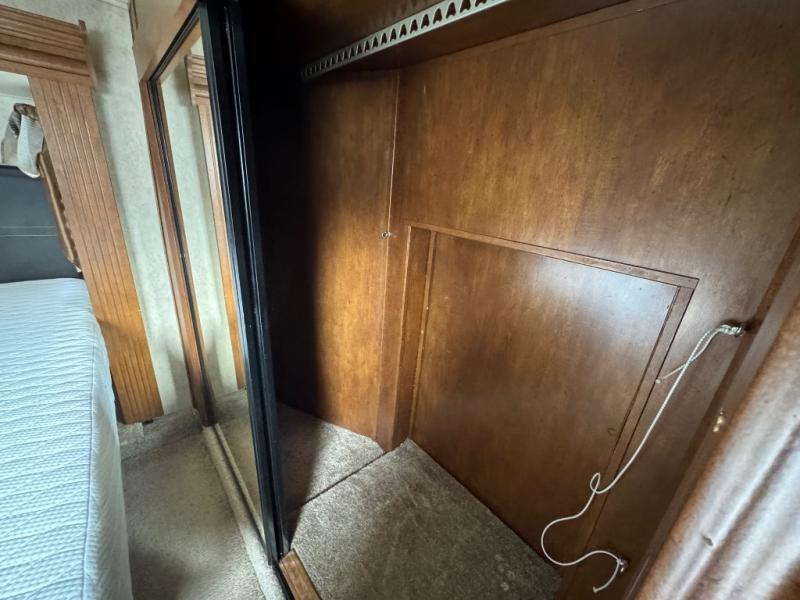 The front bedroom has a king bed slide with a nightstand and wardrobe. There is a large wardrobe located along the front wall. You will also find a dresser.