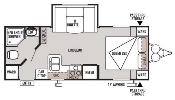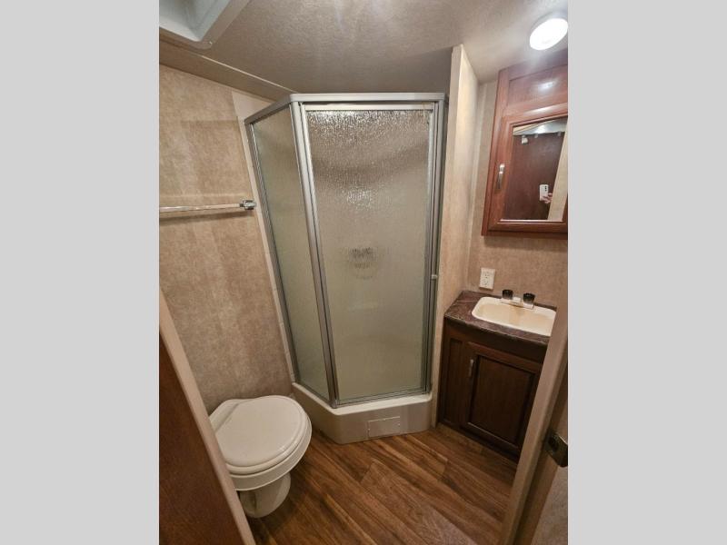 As you enter the travel trailer, to the left is a wardrobe. You will notice that the bathroom is in the rear. There is a toilet, neo-angle shower, sink, and medicine cabinet.