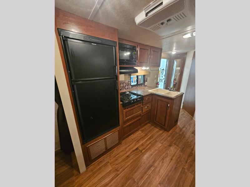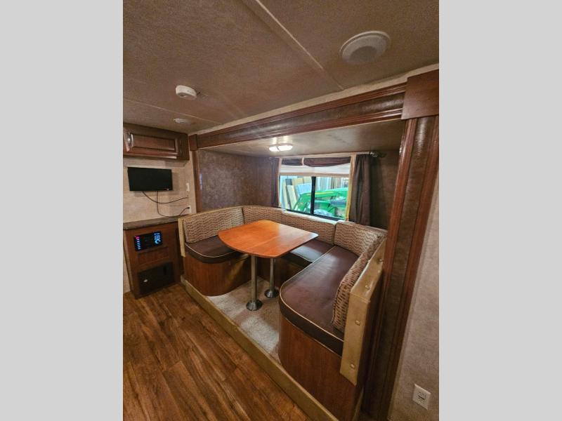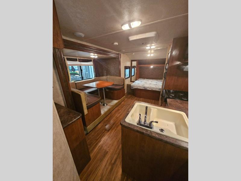 The main living area offers an entertainment center and a u-dinette slide on one side of the travel trailer. On the other side there is a double kitchen sink, three burner range, microwave, and refrigerator.