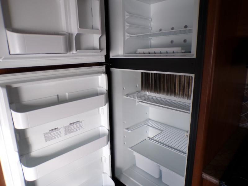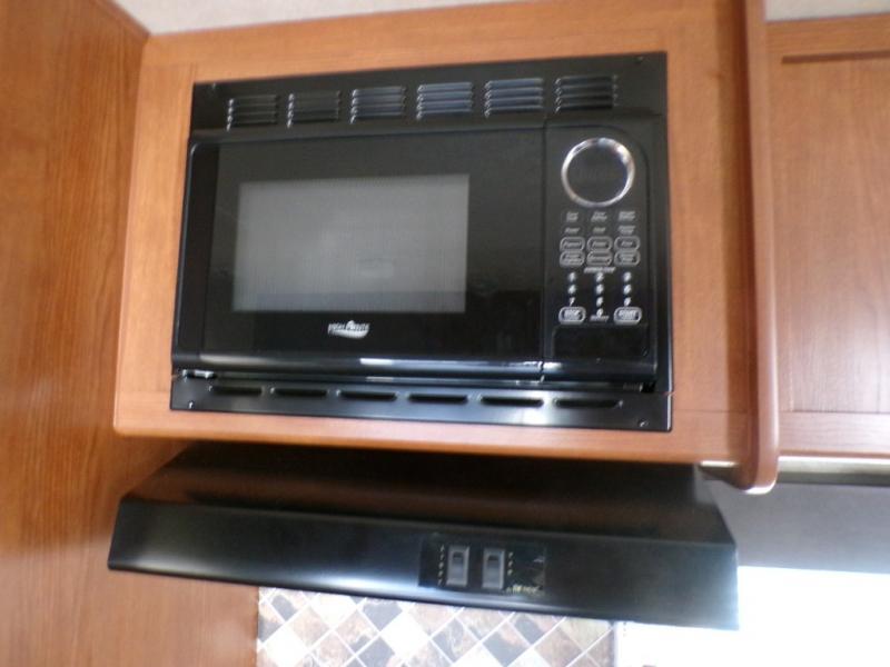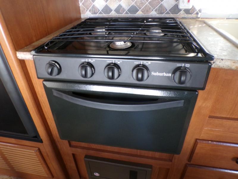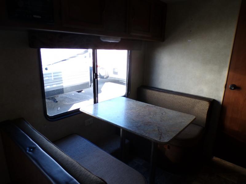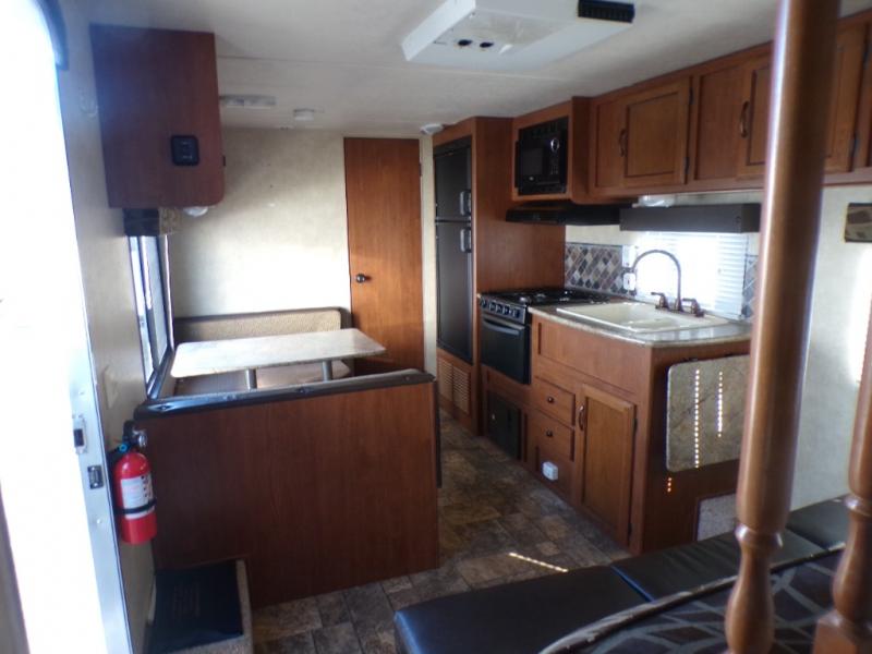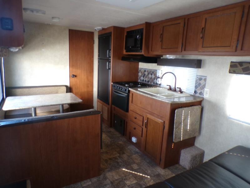 Stepping inside the travel trailer, to the left is a dinette. Straight ahead of the entrance is a sofa. Along one side you will find a double kitchen sink, three burner range, microwave, and refrigerator.