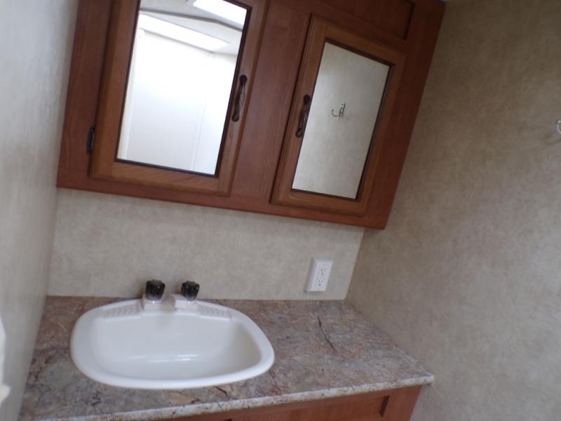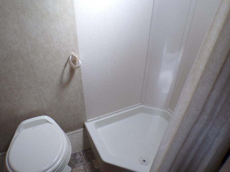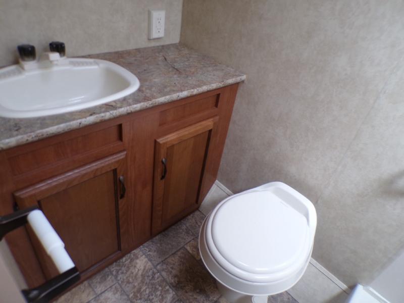 The bathroom is located in the rear of the travel trailer. There is a sink, toilet, and neo-angle shower.