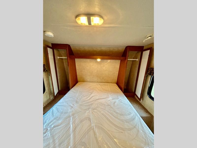 Proceeding toward the front of the travel trailer, you will see the front bedroom. There is a comfortable queen bed, and wardrobes on either side of the bed.
