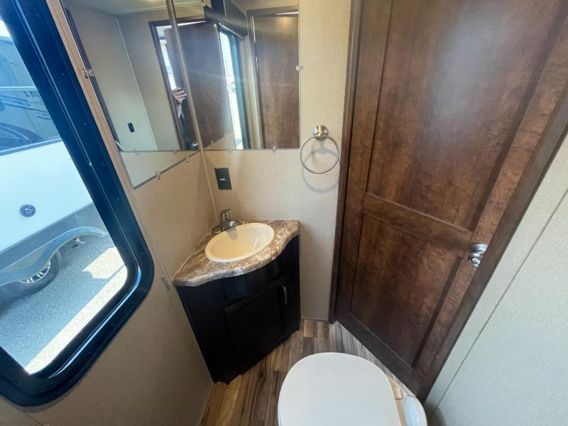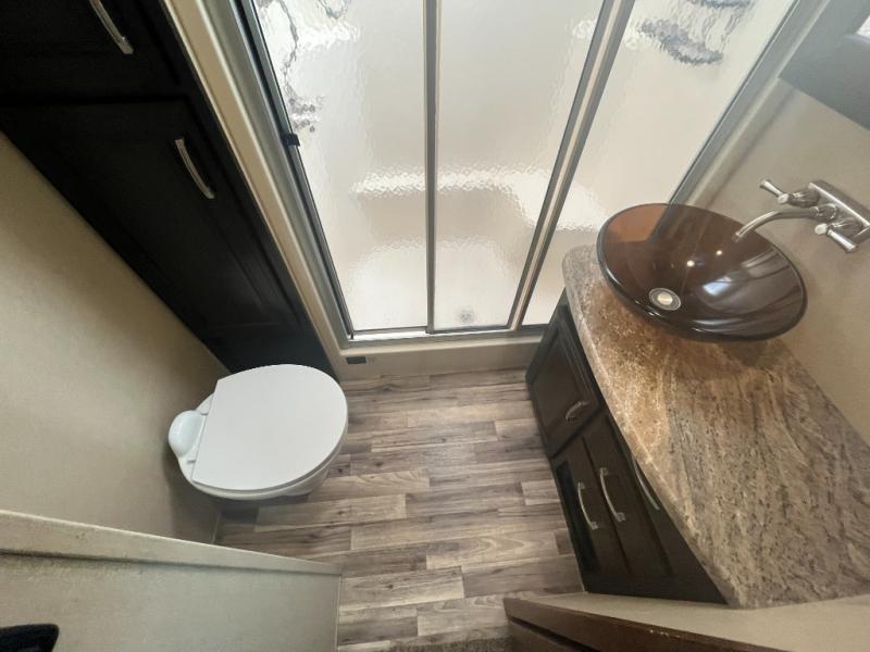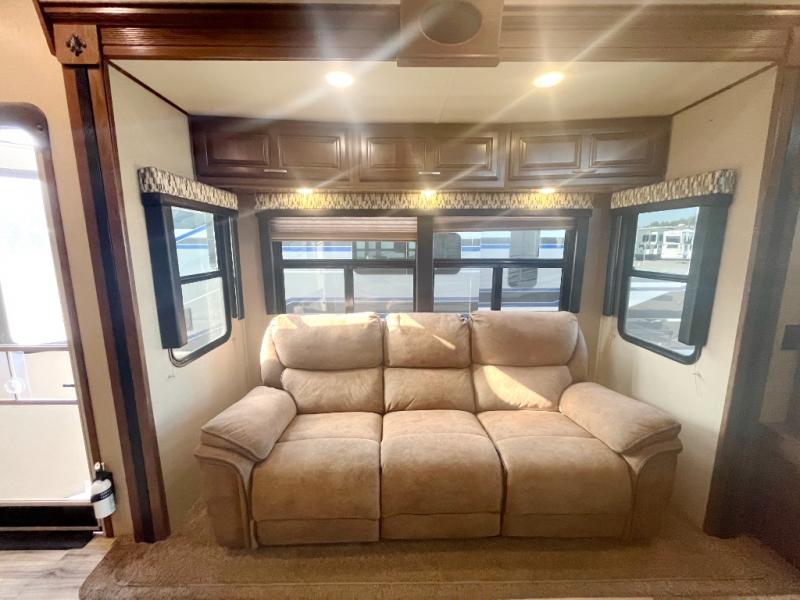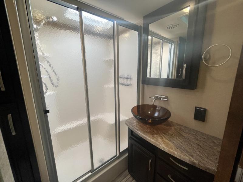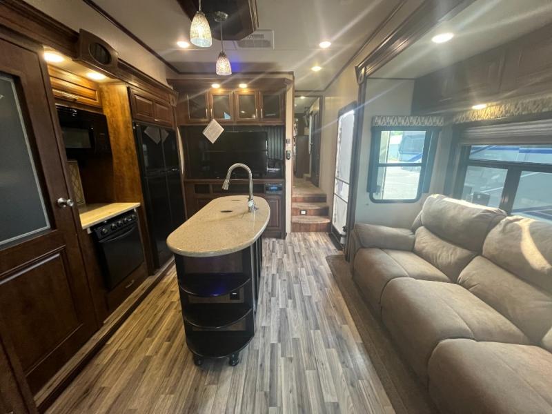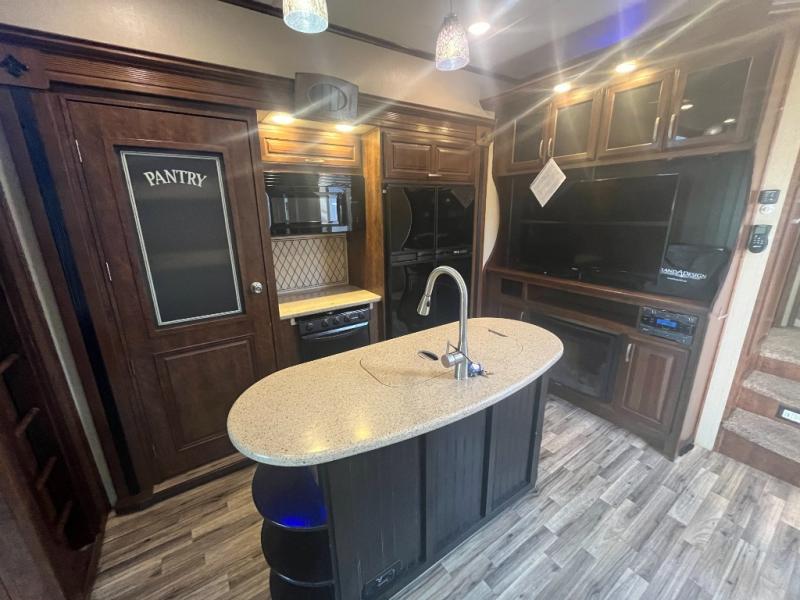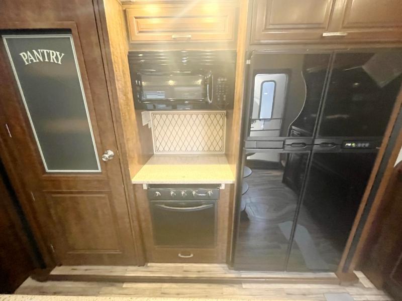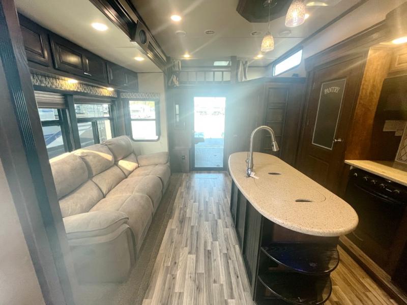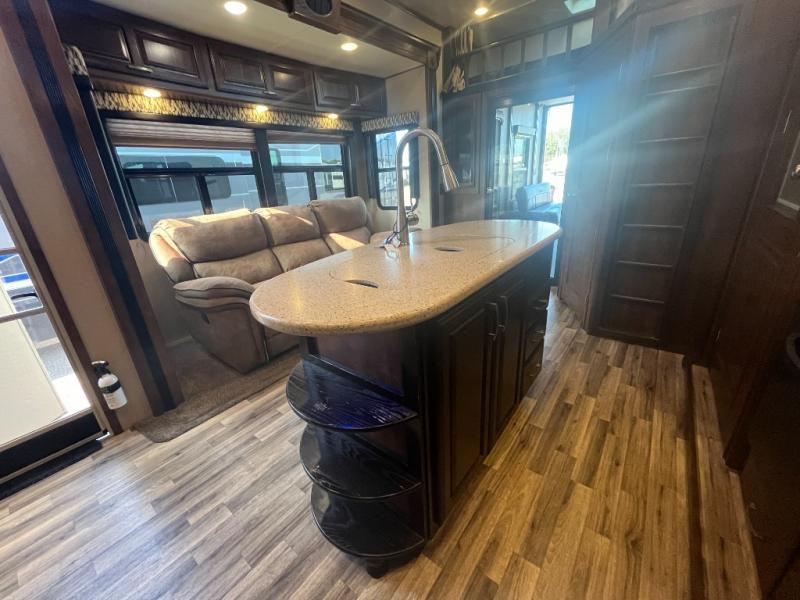 The combined kitchen and living space features dual slides with a large lounge seating slide with overhead cabinets the entire width of the fifth wheel, plus a stowable table for convenient dining. Across the room there is a pantry, 3 burner range, refrigerator, and second smaller pantry for cooking and food storage. A kitchen island with double sinks makes food prep and clean up a breeze also.