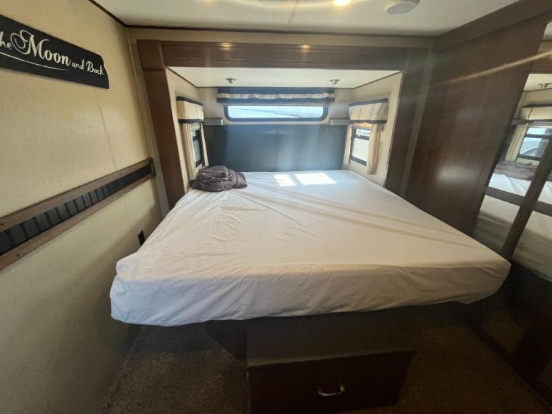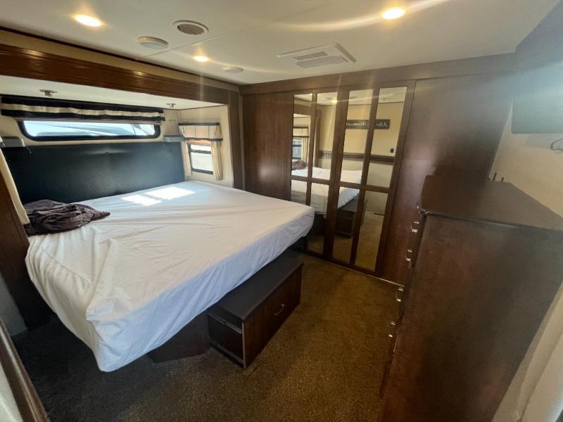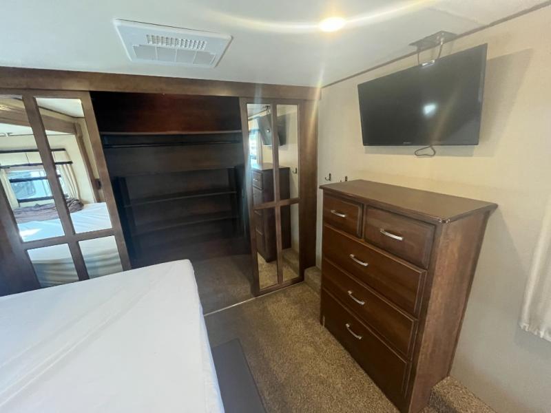 The front master suite features a slide-out queen bed with optional king. There is a pull-out ottoman at the foot of the bed, a dresser with optional HD TV above, and a large closet with shirt storage on one side and washer dryer prep opposite, and so much more!
