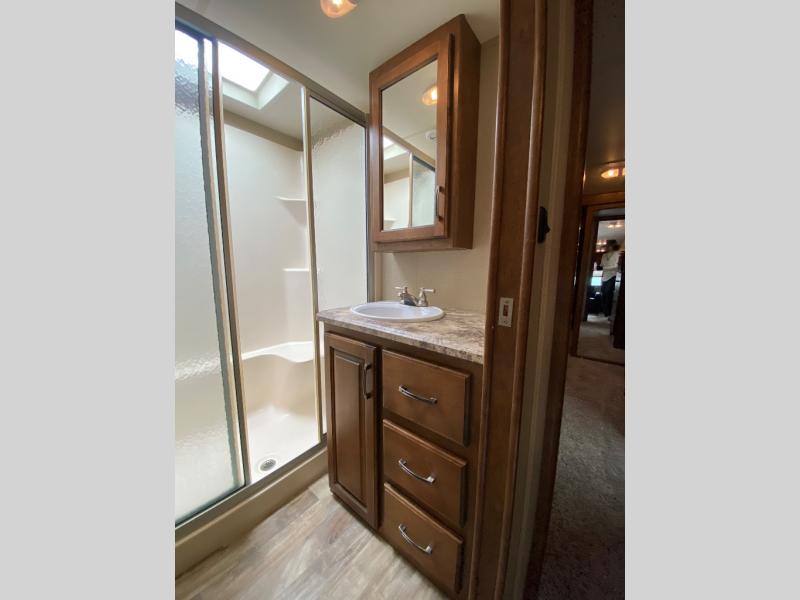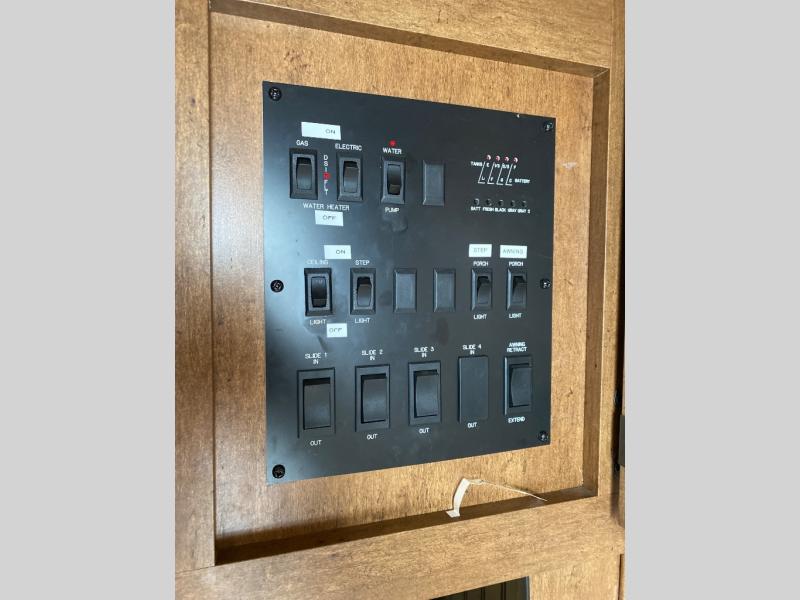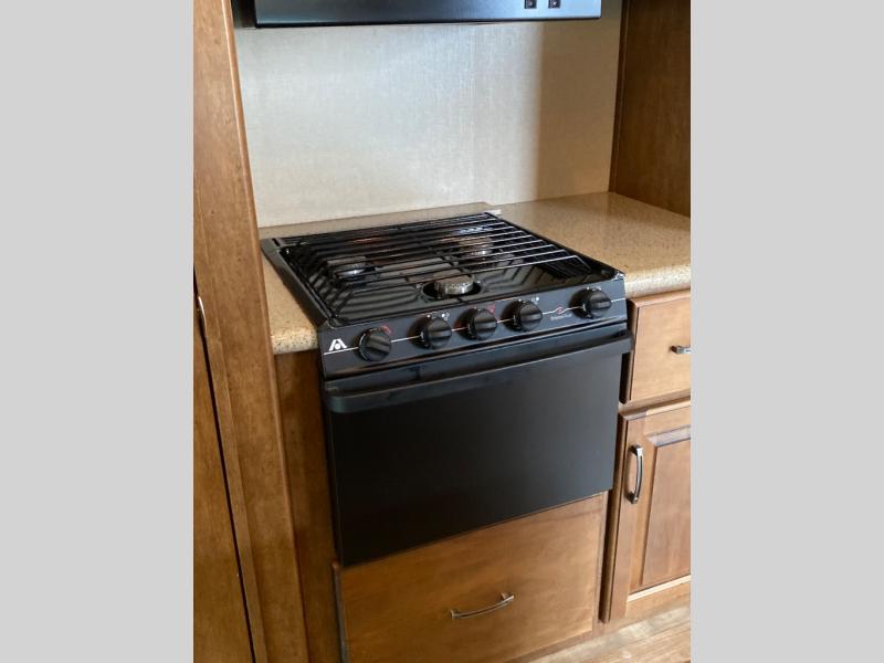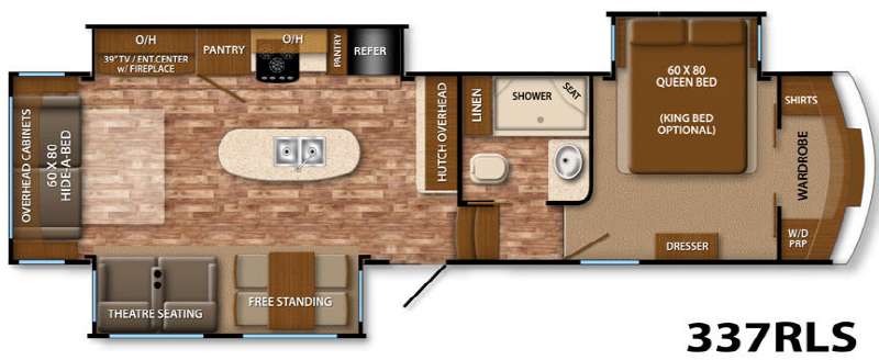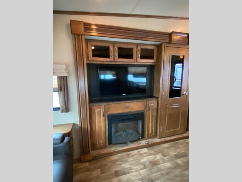 There is a free standing dinette and theater seating to the left of the entry door in a slide out. A hutch with overhead is located straight in from the main entry door. The slide on the opposite side of the room features a refrigerator, pantry, three burner range with overhead storage, pantry and 39" TV entertainment center with fireplace below.