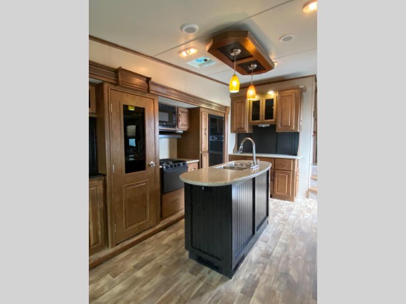 The rear wall features a 60"x80" queen hide-a-bed sofa with overhead cabinets above. There is a center island with double kitchen sink, and plenty of counter space too.
