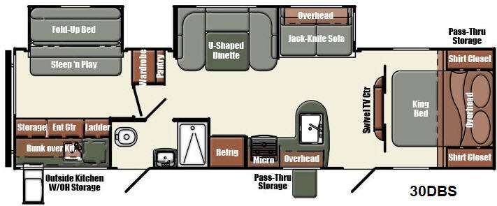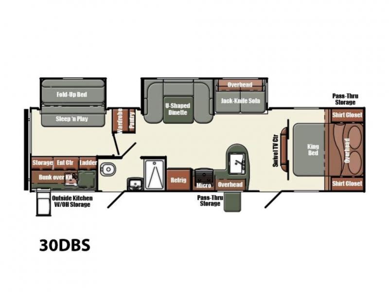 Now, step inside and get a look at the conveniences inside with double slide-outs, bunks for the kids, a king bed for mom and dad, and so much more.