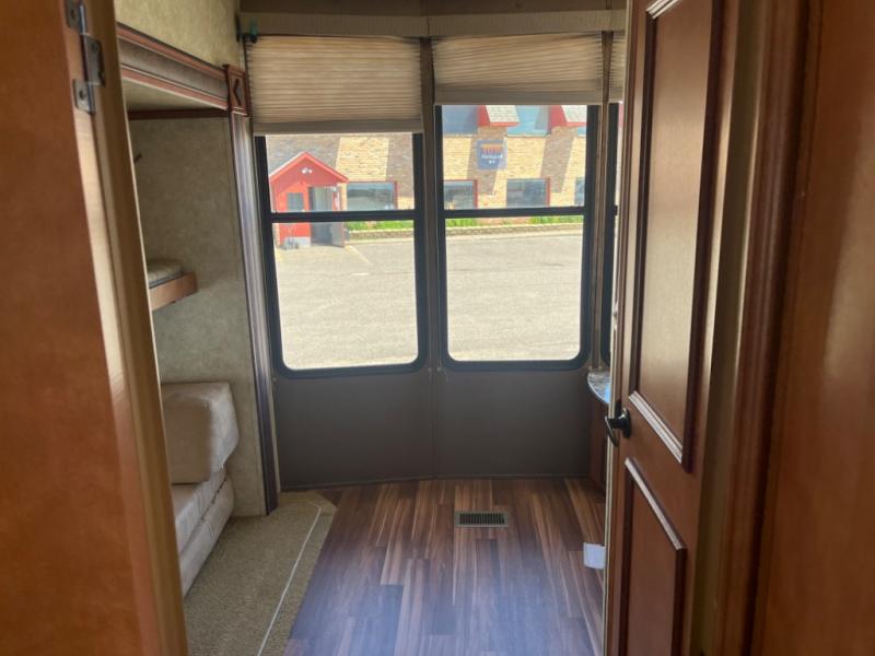 As you enter the glass patio doors you will see an entertainment center on your right. Further in notice a door leads to the front bunkhouse that features a set of bunk beds in a slide out. On the opposite side there is an entertainment center, closet, and half bath with a toilet, sink and a linen cabinet.