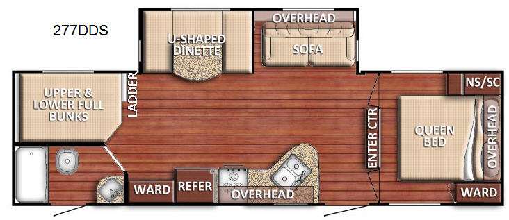 Kingsport Bunkhouse Travel Trailer by Gulf Stream Coach w/Rear Corner Full Size Bed Bunks w/Rear Ladder, Rear Corner Bath w/Private Entry Including: Tub/Shower, Toilet & Sink, Wardrobe, Refrig., 3 Burner Range, Dbl. Kitchen Sink, U-Shaped Dinette & Sofa w/Overhead Storage Slide, Ent. Center, Front Queen Bed w/Nightstand Below Shirt Closet & Wardrobe and Much More!