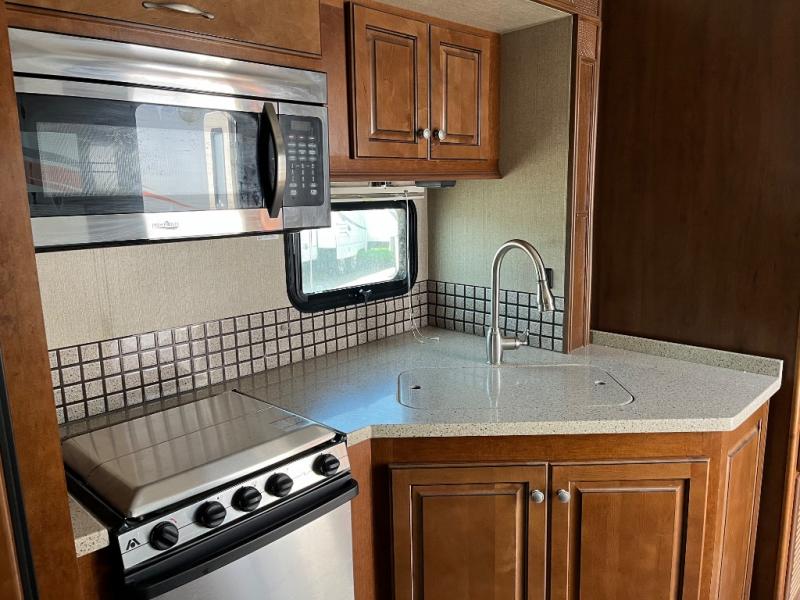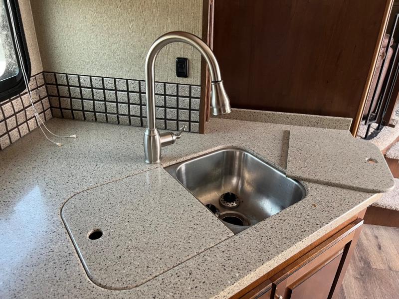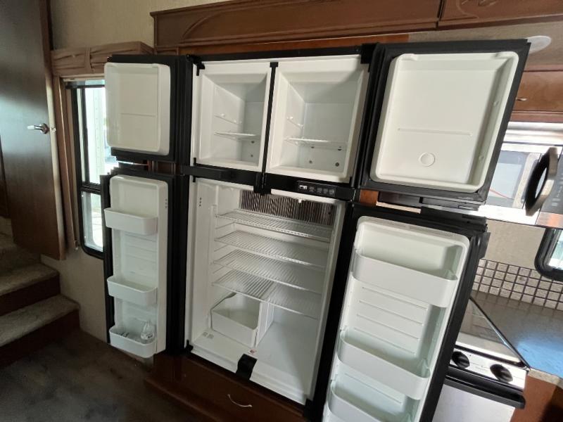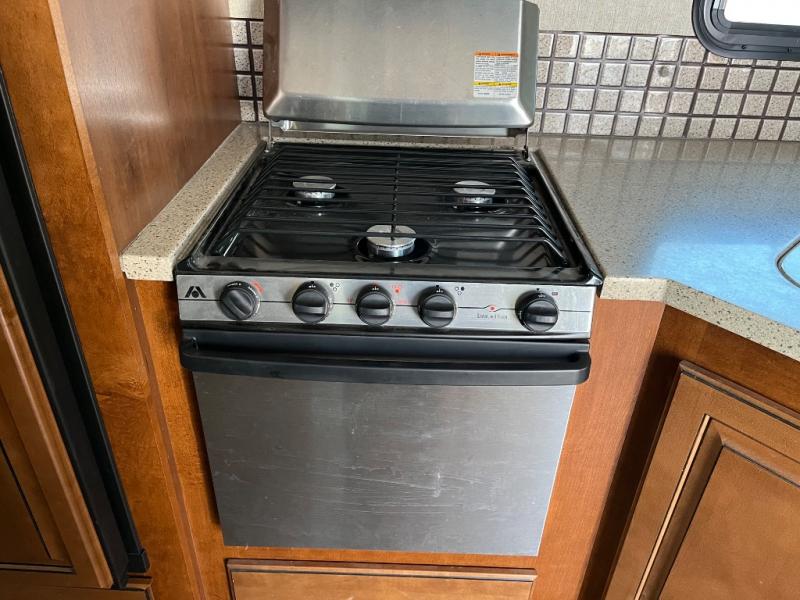 As you enter you are in the kitchen and dining area with a Versa table to your immediate left including four chairs. There is a counter area to the left of the table and a slide-out double door refrigerator, three burner range, and double sink across the room. There is also a convenient pantry too.