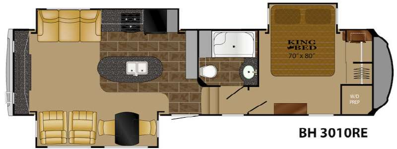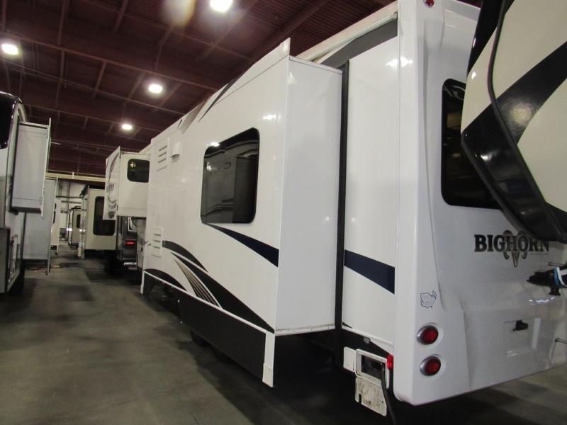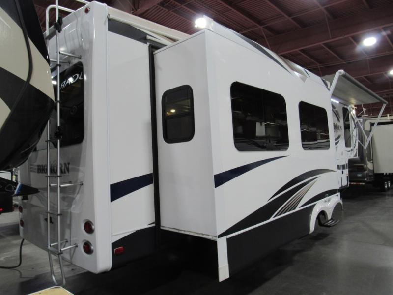 Step inside this rear entertainment Bighorn fifth wheel model 3010RE by Heartland RV featuring triple slides, a convenient kitchen island, and king size bed!