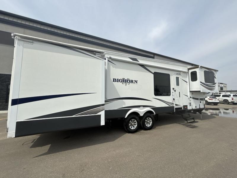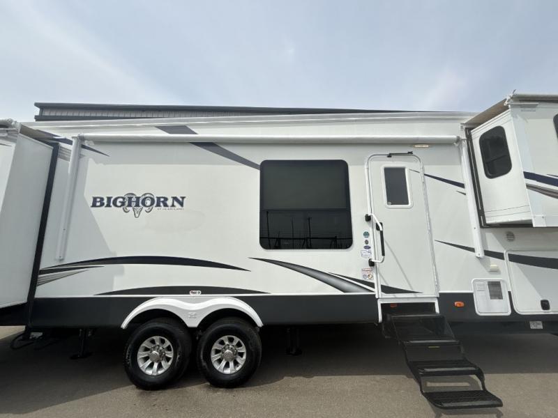 Bighorn Fifth Wheel by Heartland RV w/Rear Queen Bed Slide, Wardrobe Slideout, Angle Shower, Lav., Private Toilet Area, Dinette w/2 Chairs, Pantry, Slideout Dbl. Kitchen Sink, Overhead Cabinet/3 Burner Range/Pantry & Refrig. Slide, Step Up to Front Living Area w/Front Wall Ent. Center & Storage, L-Sofa Slide, Opposite Sofa Slideout and Much More! Avail. Options May Include: Sofa & Recliner IPO L-Sofa.