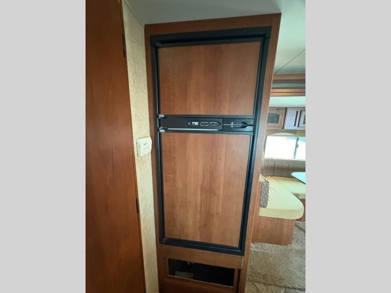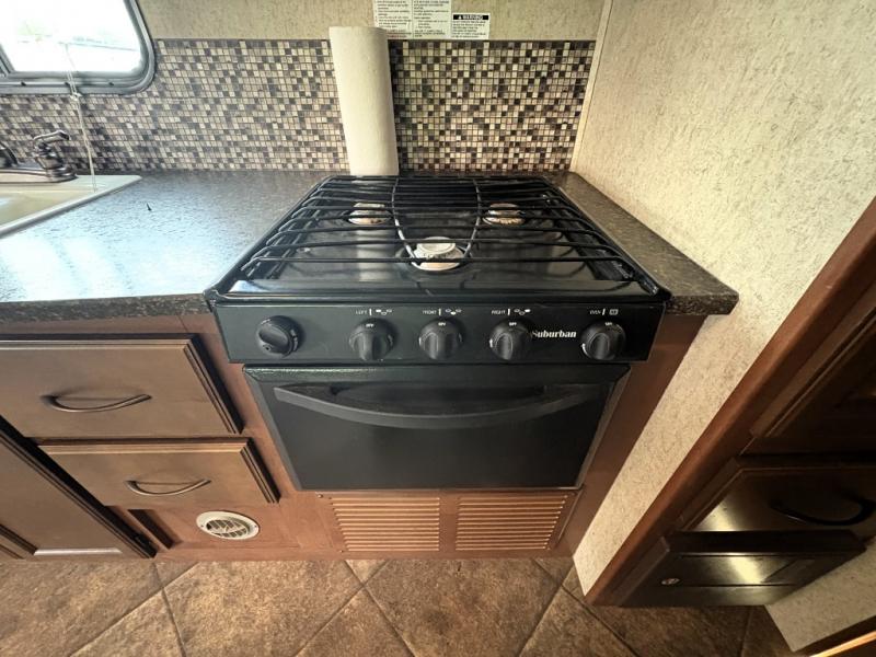 Across from the dinette you have everything you need to prepare and cook food for your family. There is a pantry, three burner range, counter space and a double kitchen sink for food prep and cleanup. The overhead cabinet provide plenty of space for storing dishes and things. There is also a refrigerator on the opposite side near the u-shaped dinette.