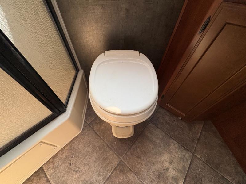 The rear bathroom features a convenient angled shower, toilet, and sink. Plus you will find ample storage in the two linen cabinets, and so much more!