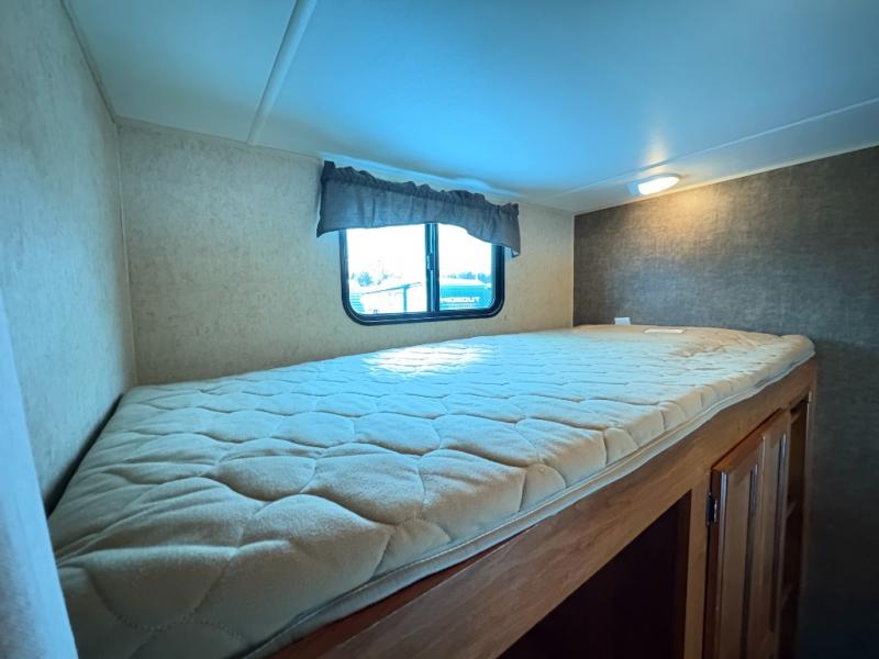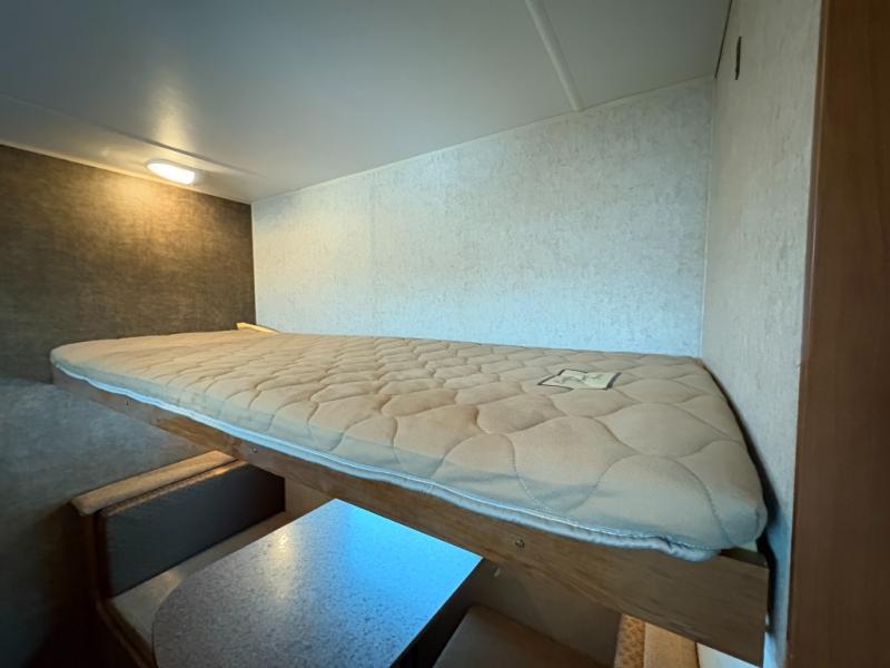 A sliding door in the rear of this unit leads into the bunkhouse which features a set of bunks on the right, and a 3rd bunk above a wardrobe and entertainment center with ladder.