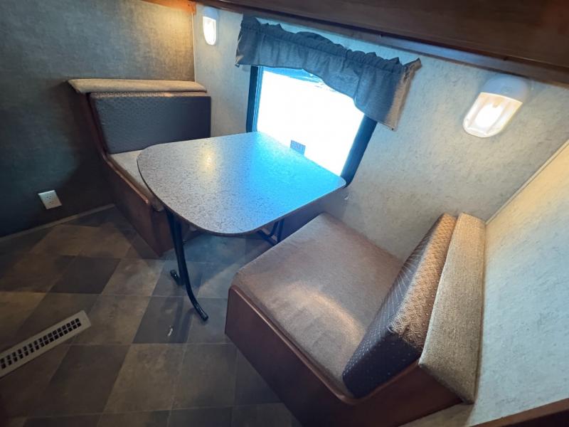 The side opposite features a slide-out sofa and u-shaped dinette which provides plenty of seating for everyone during mealtime, playing board games, or just hanging out. A storage pantry is located just off the dinette slide for all of your dry goods and more.