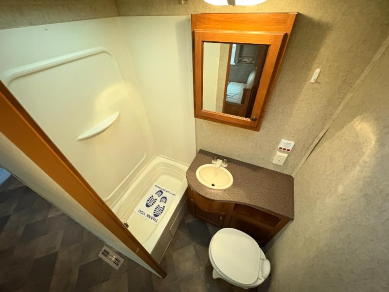 Step inside model 30ODK and see a private front bedroom with dual entry doors on either side of the entertainment center. There is a comfortable queen size bed with overhead storage, plus nightstands and shirt closets on both sides. The entertainment center features a swivel TV box so it can easily be viewed in the bedroom as well as the main living area.