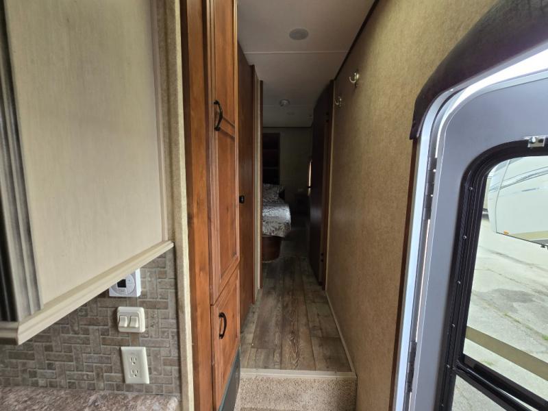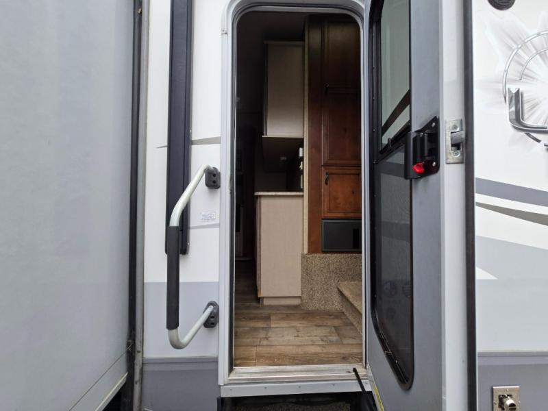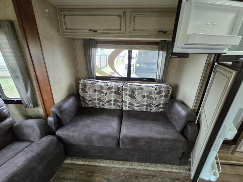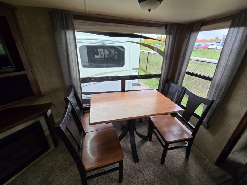 Back down in the main living space you will enjoy the open feel that the dual opposing slides create. The slide on the left passed the front entry door features a dining table with chairs, and an entertainment center with a fireplace below. There are two recliners along the rear wall with an end table between, plus overhead storage the entire width of the unit.