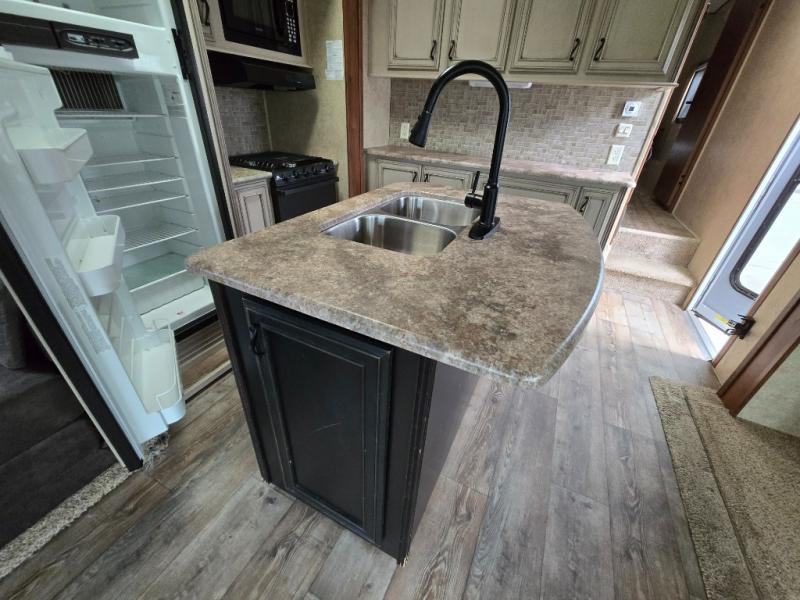 The second slide opposite the door offers a sofa with overhead cabinets, and kitchen amenities such as a refrigerator and three burner range with microwave above. The kitchen island features a double sink with optional bar stools, and there is more overhead storage and counter space along the interior wall, plus so much more inside and outside this fifth wheel!