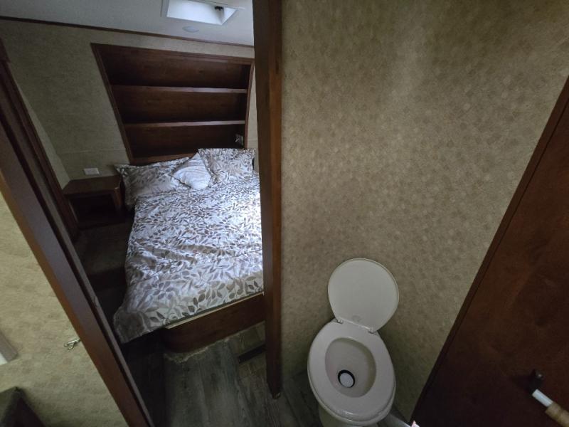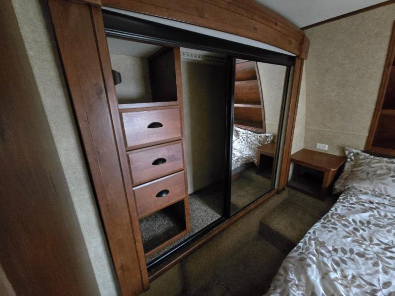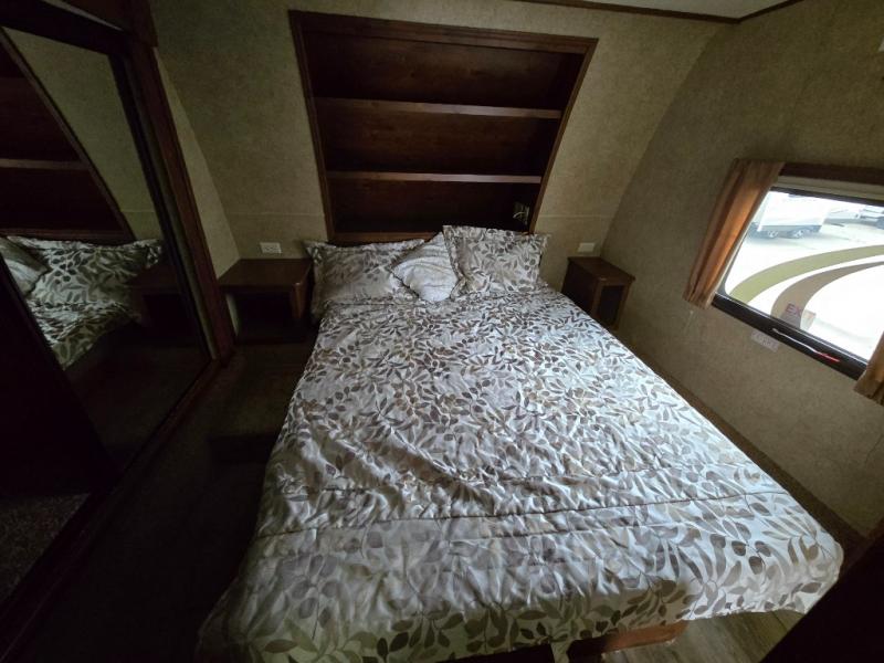 Get a great nights sleep on the queen bed provided in the private front bedroom including nightstands with open storage below including a cargo net, plus a slide out wardrobe with mirrored doors. There are also added drawers in the slide for your things, and storage shelves above the bed too.