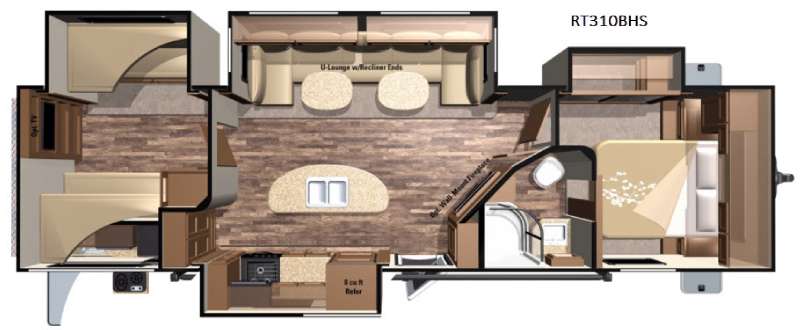 This Open Range Roamer travel trailer RT310BHS features quad slides, a private bunkhouse that the kids or guests will love, a kitchen island, and an outside kitchen too!